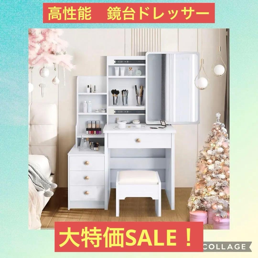 - 妻がドレッサーが欲しいと言い出し,購入しました。それまで化粧品道具はダイニングテーブルや床の上に 無造作に置かれていたので、専用の収納スペースがあるとよいかもと考えて購入を決めました。 結果は大正解で、部屋がすっきりとしました。妻によれば、このドレッサーの良い点は、 天板全体が蓋のようになっているのではなく、引き出しの上の部分は固定されていて開かないようになっているところだそうです。妻はそこに照明を置いています。購入したのはナチュラルです。正面の接ぎ合わせた板の色の違いが少し気になりましたが、このお値段ならば文句はありません。スツールもしっかりして、妻は踏み台としても使っているようです。